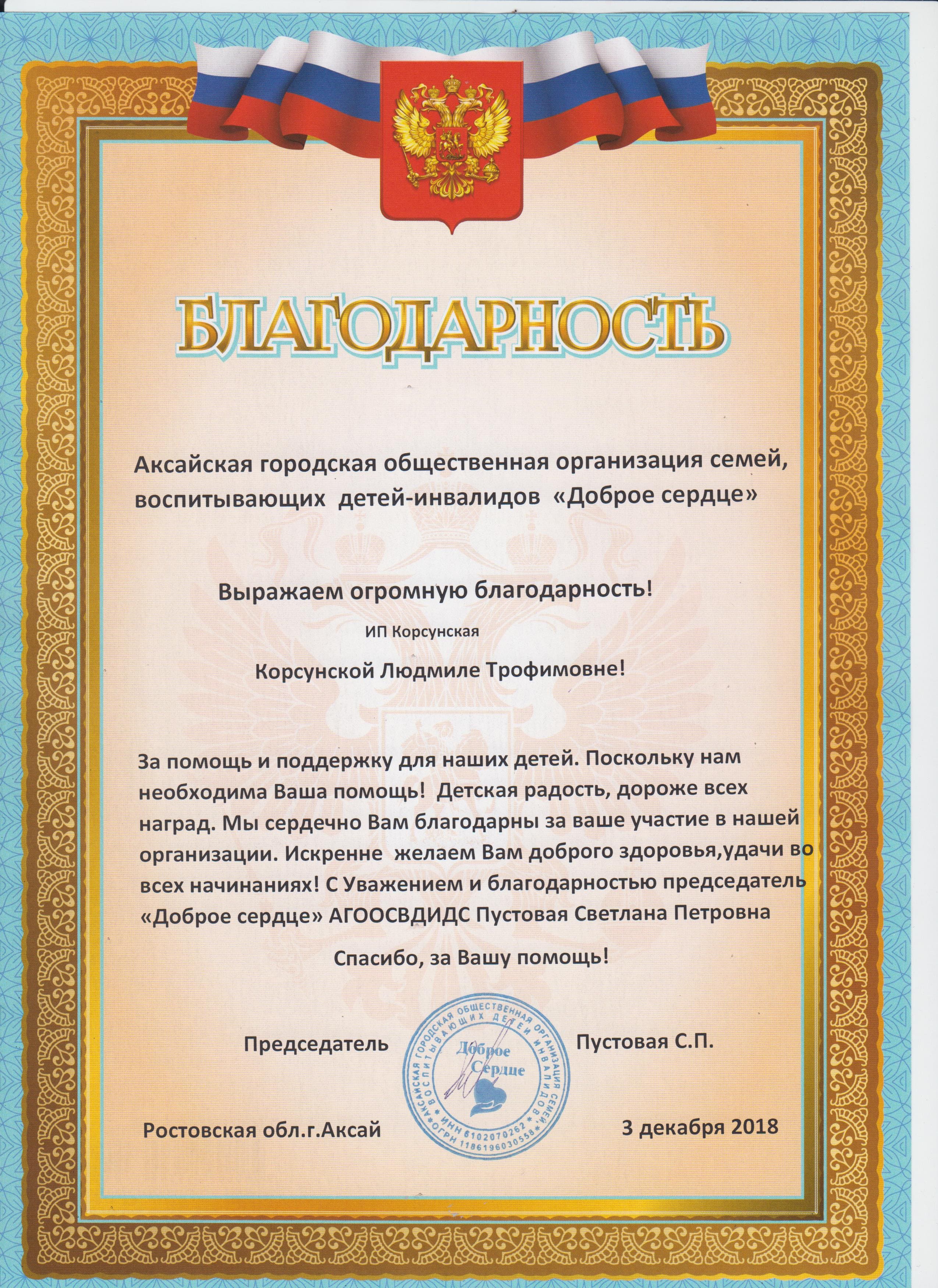 Благодарность от БО «‎Доброе Сердце» 1.4 мб