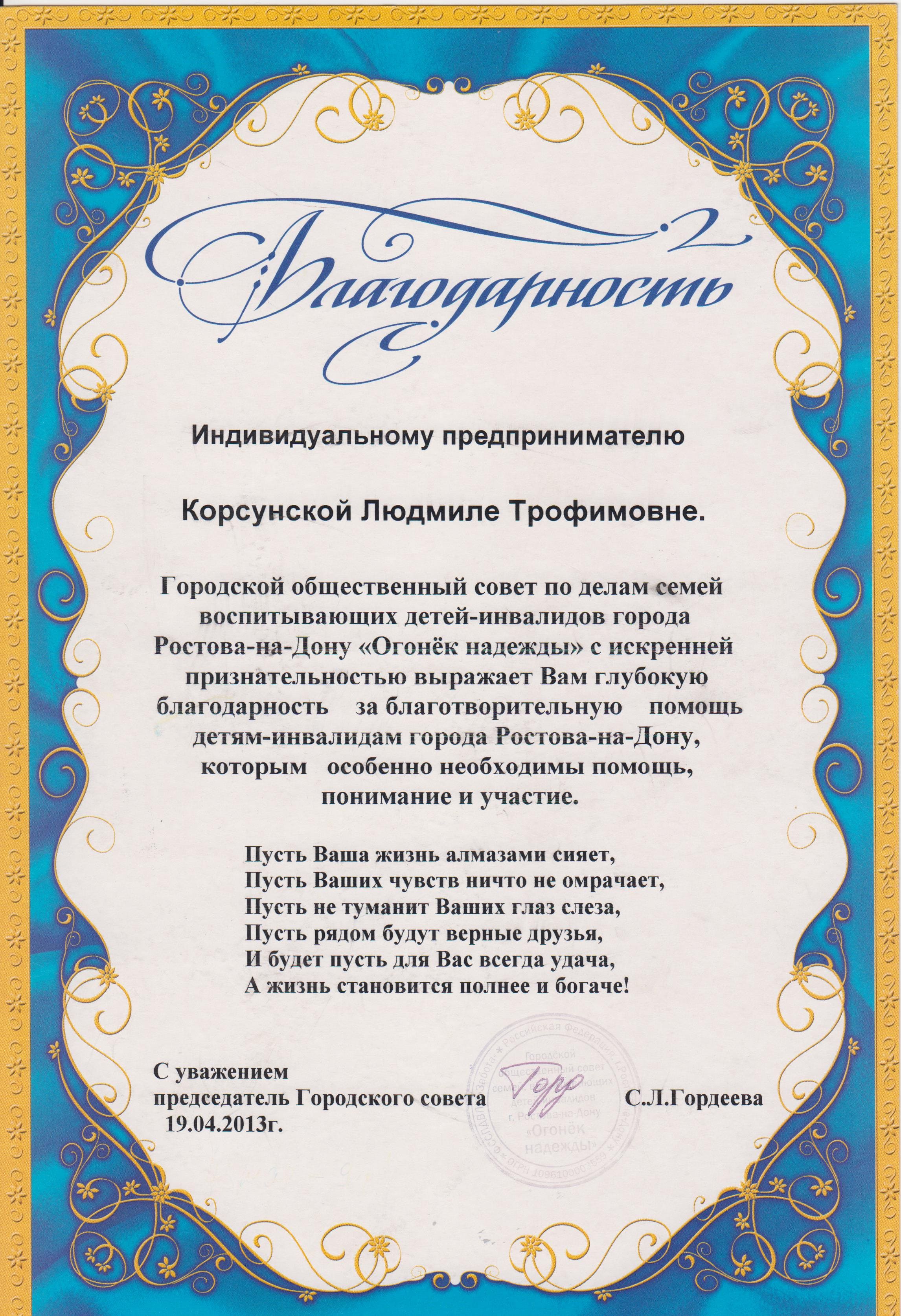 Благодарность от БО «Огонёк Надежды‎» 2013 г.
