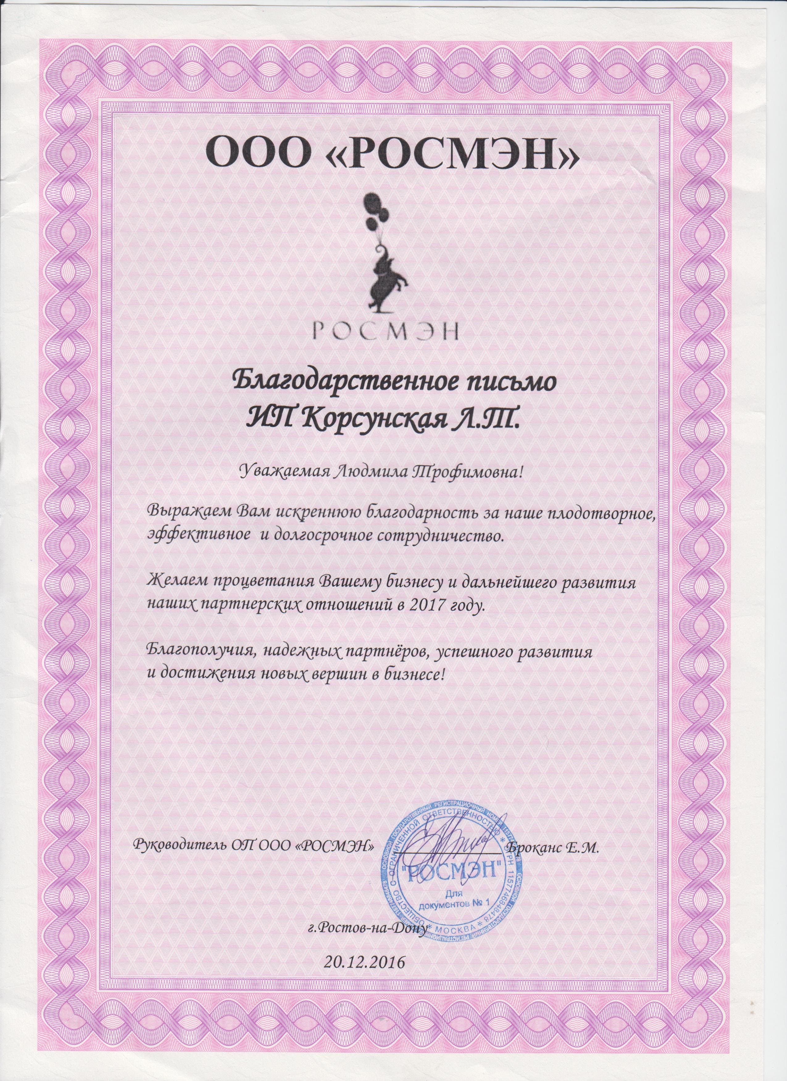 Благодарность от издательства «Росмэн‎» 1.3 мб