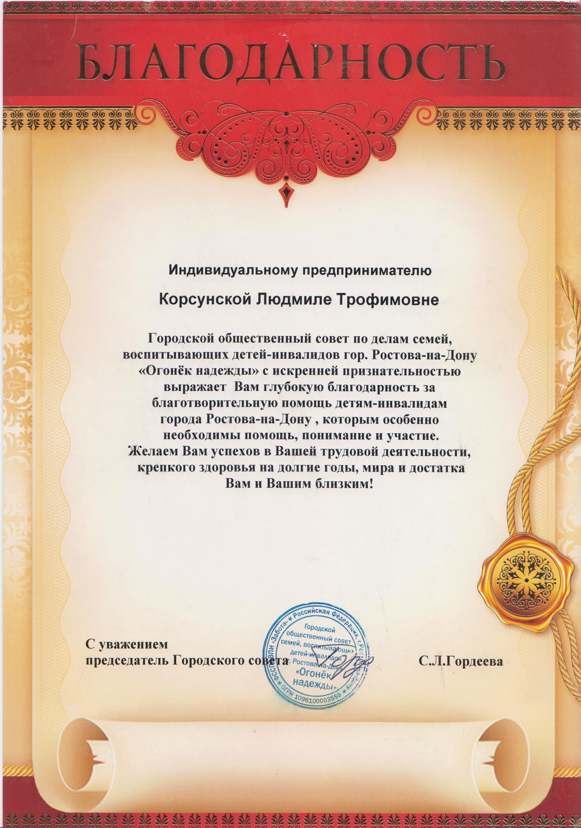 Благодарность от БО «Огонёк Надежды‎»