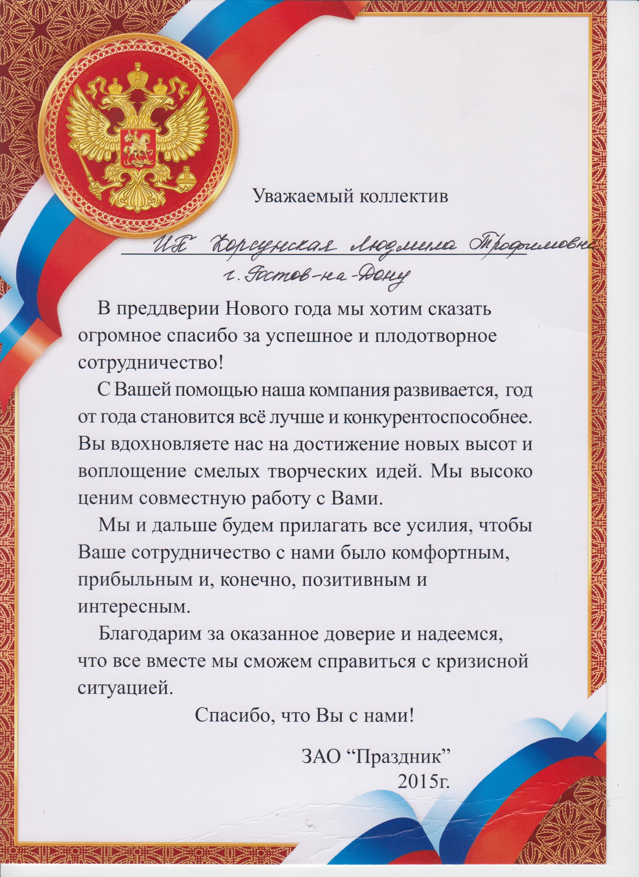 Благодарность от ЗАО «Праздник‎» 844.4 кб